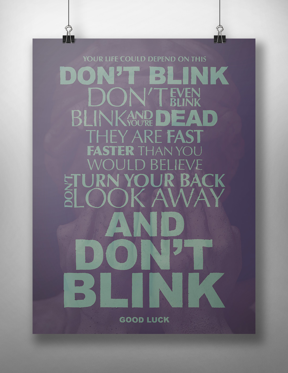 This type poster was inspired from a quote from the British series, Doctor Who. The project was part of a series of posters with a primary focus on typography and layout. As the subject is a Weeping Angel, a series villain, I wanted to give the text a rough, stoney, worn appearance to match the contour, shape, and edges of the figure. To help achieve this, I used a displacement map from the image of a weeping to subtly transfer the contour into the letters.